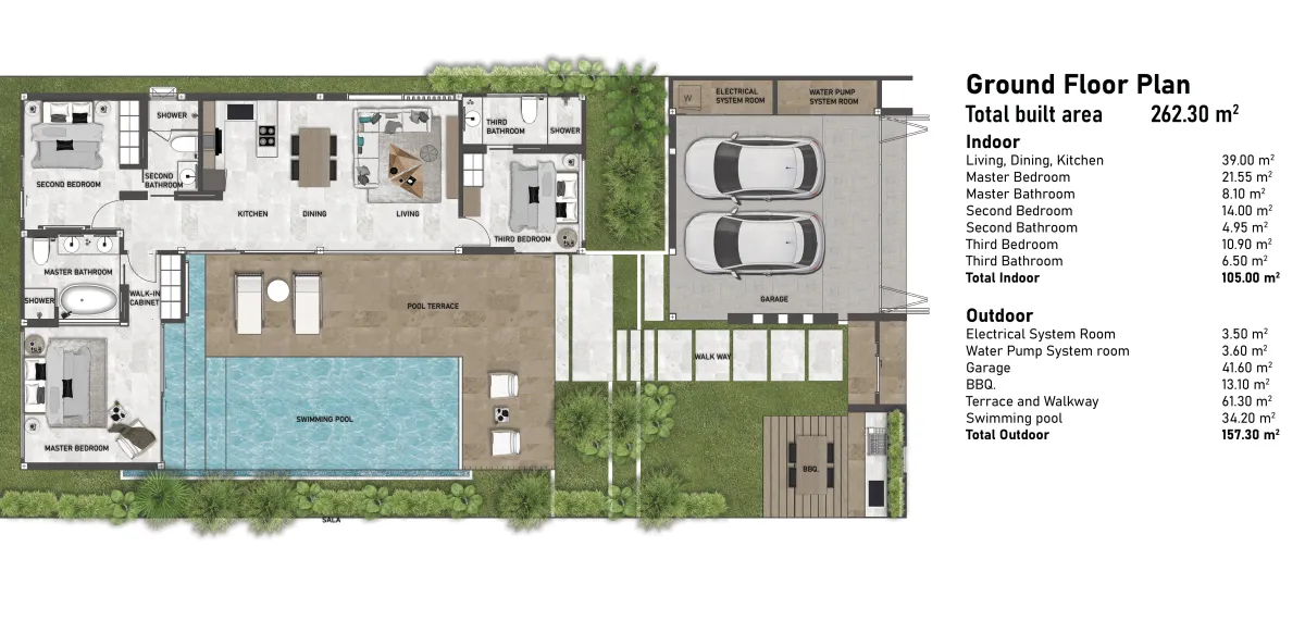 Villa Sunpao V1 presents a refined tropical retreat with three spacious bedrooms and three bathrooms, an open-plan living area, private pool, and generous outdoor spaces. A BBQ area enhances outdoor dining, combining functionality with a relaxed atmosphere. Ideal for private residential living or short-term rental investment, it offers comfort, style, and potential.